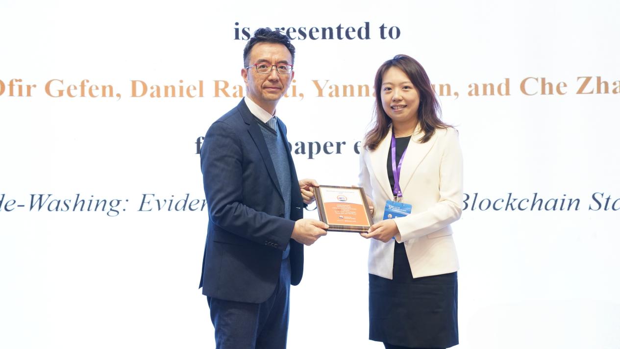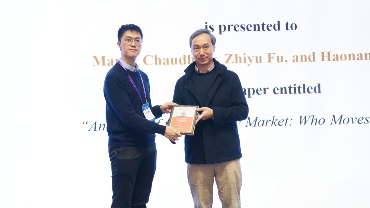 图为于晓筠教授为资产定价最佳论文奖颁奖