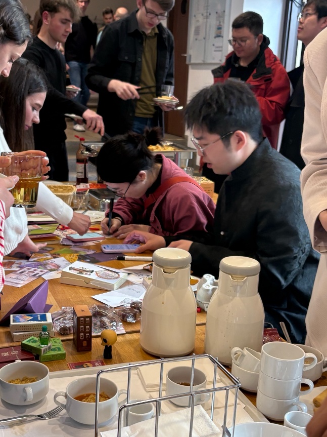 在“文化之夜”(Evening of Cultures)活动中,各国学子通过美食、服饰与才艺展示本国文化特色。五道口学子精心准备了中国传统美食与文化展示,与来自不同国家的同学分享中华饮食文化与人文内涵。春卷、奶茶、毛笔、贺卡等中国元素吸引了众多国际同学驻足体验,生动展现了文明交流互鉴之美。